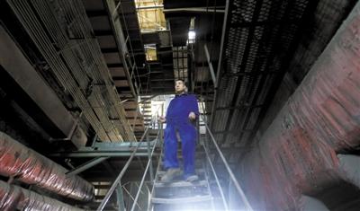 昨日,石景山区首钢重型机器分公司,最后一批煤被送进供暖锅炉,刘师傅在清理入口处的煤块。本版摄影/新京报记者 浦峰