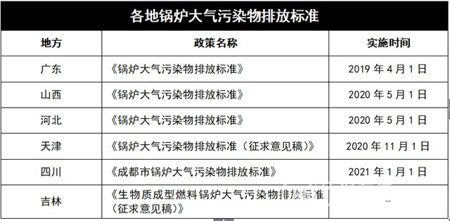 在2019年和2020年初,很多地方纷纷修订发布锅炉大气污染物排放标准,并确定了具体的实施时间,具体如下: