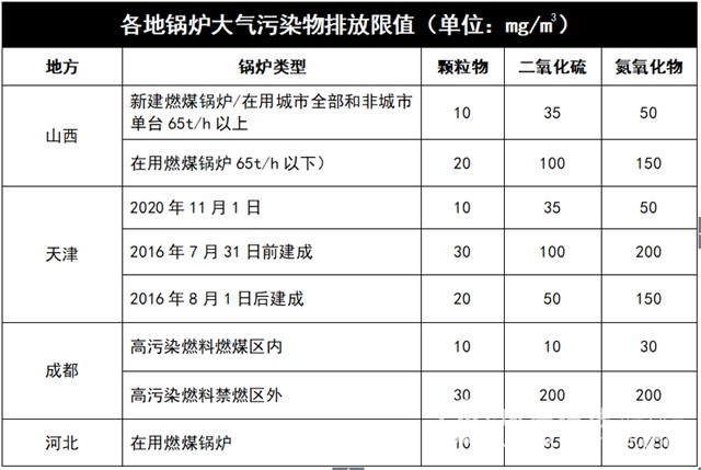 为尽快实现空气污染治理目标,各地在锅炉大气污染治理上严格遵守“因地制宜”原则,很多地方的标准远远严于国家的锅炉大气污染物排放标准和要求。就拿燃煤锅炉看来,具体如下: